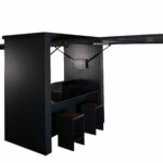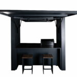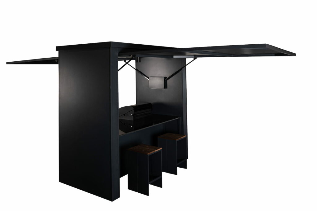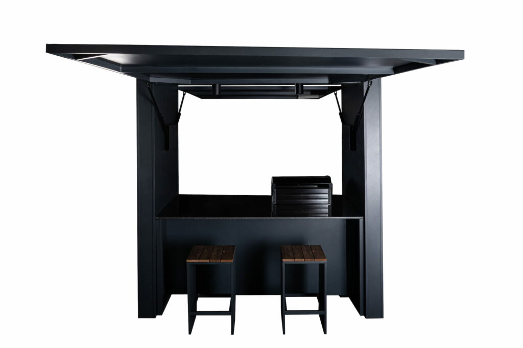On one side, there is a professional grill kitchen, while on the other, you’ll find a dining and bar table with seating, including two elegant Grillandia bar stools.