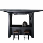 On one side, there is a professional charcoal Kamado grill, while on the other side, there is a dining and bar table with seating, including two elegant Grillandia bar stools.