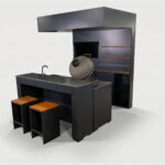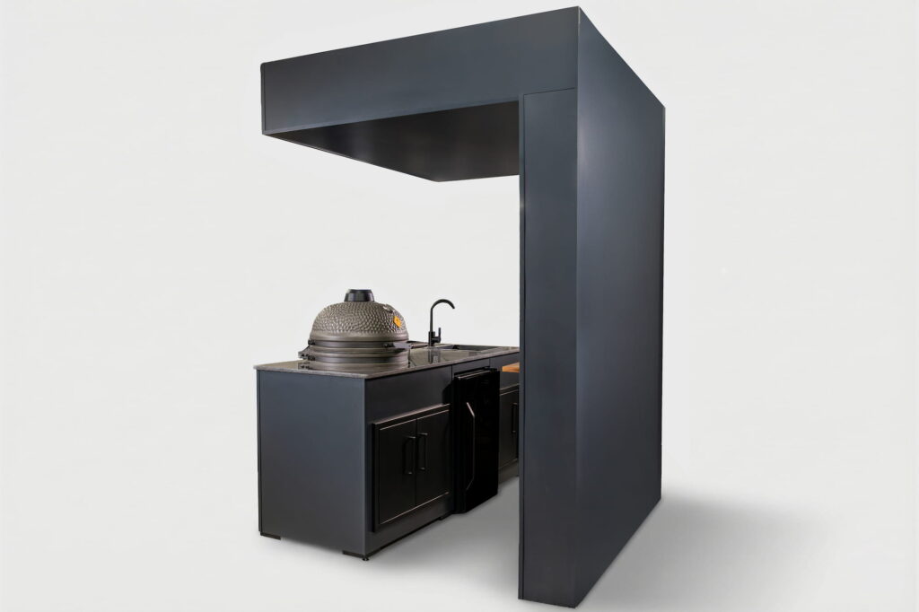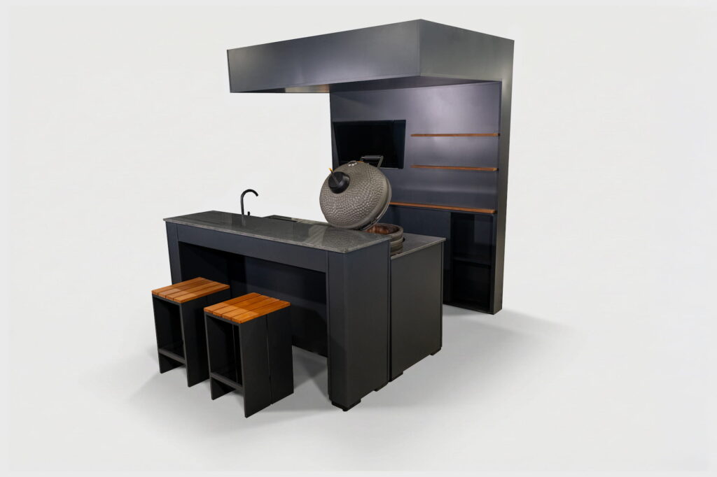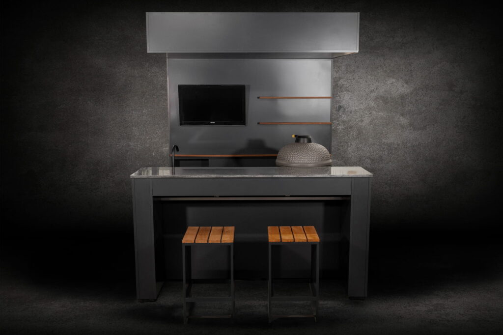 A compact yet versatile outdoor kitchen configuration. This highly aesthetic model — featuring a back wall, sliding-door lockable lower shelves, and a roof yet remaining open — is essentially based on The Egg Nest II model, but expanded with a TV, a movable bar counter, and two bar stools, creating a full-service setup for any grilling or outdoor cooking occasion.