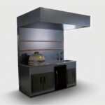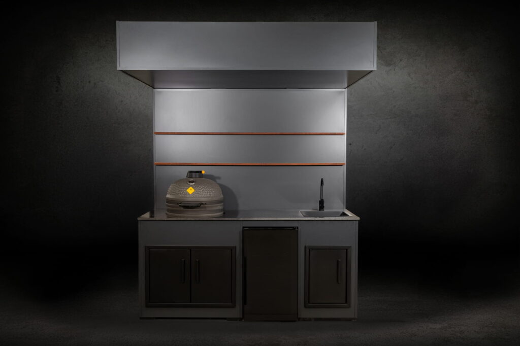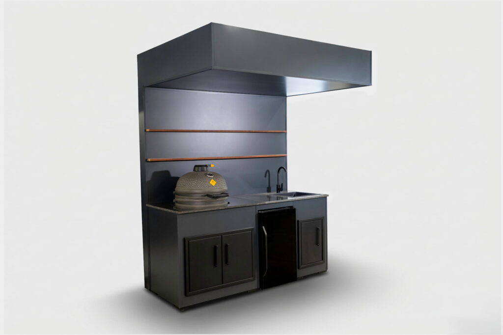 This highly aesthetic model with a back wall and roof — yet still open — is essentially an evolution of The Egg Nest II, expanded with a showcase beverage cooler and a sink. Like every Grillandia product, it is a long-lasting outdoor kitchen configuration made from 100% aluminium.